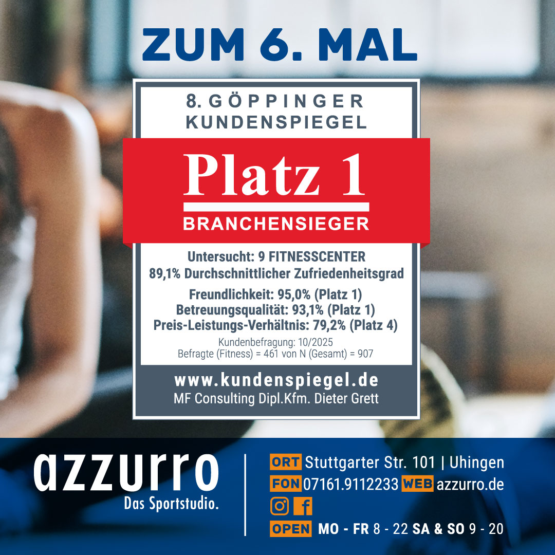Das azzurro wird zum sechsten Mal in Folge zum Branchensieger im "Göppinger Kundenspiegel" gekürt! 🏆🥇